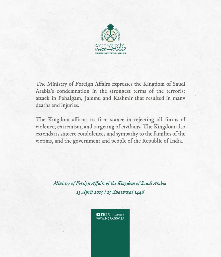 - Details: The timing of Modi’s visit amplified Saudi Arabia’s response, with MBS’s public condemnation signaling strong bilateral alignment. Saudi state media covered the attack extensively, framing it as an assault on civilian safety.