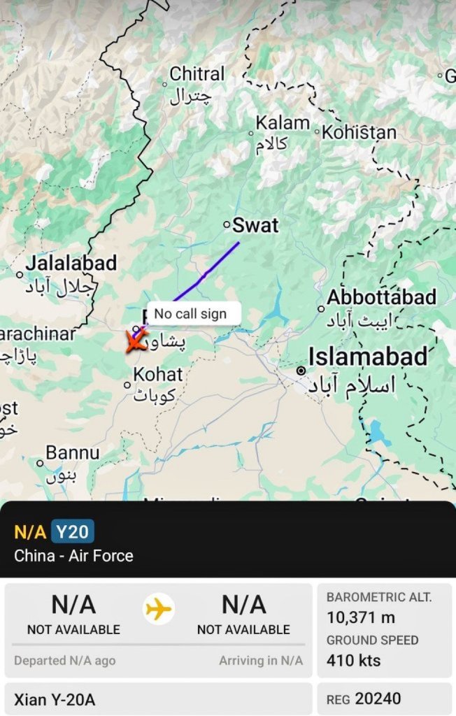 Meanwhile, Chinese PLAAF Y-20 cargo aircraft departed Saidu Shariff Airport in Swat, Pakistan and is currently en route to an unknown destination.