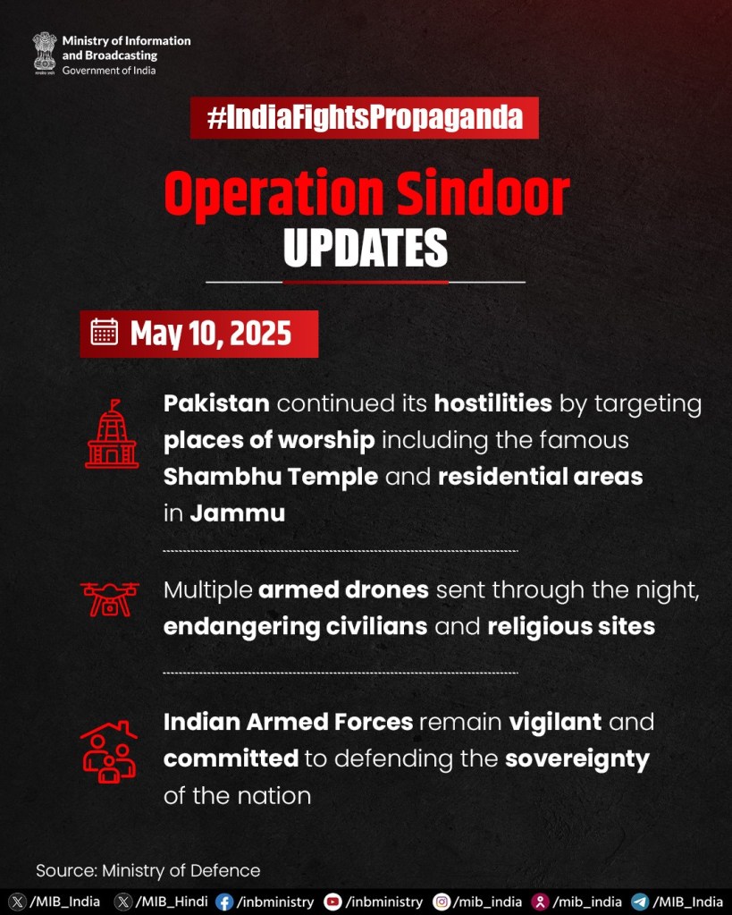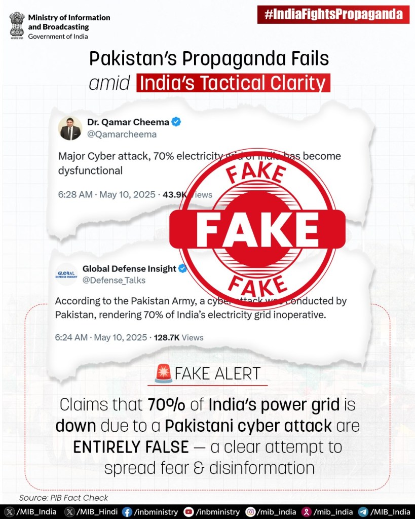 - 01:55 IST: The Times of India reports Pakistan’s disinformation campaign, including fabricated claims of military victories. Indian officials note Pakistan’s goal is to “flood the information space with falsehoods.”